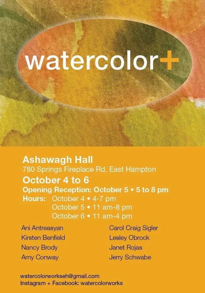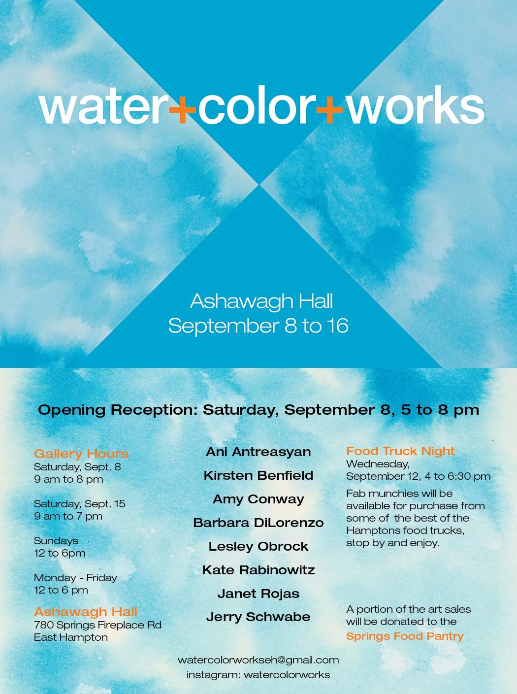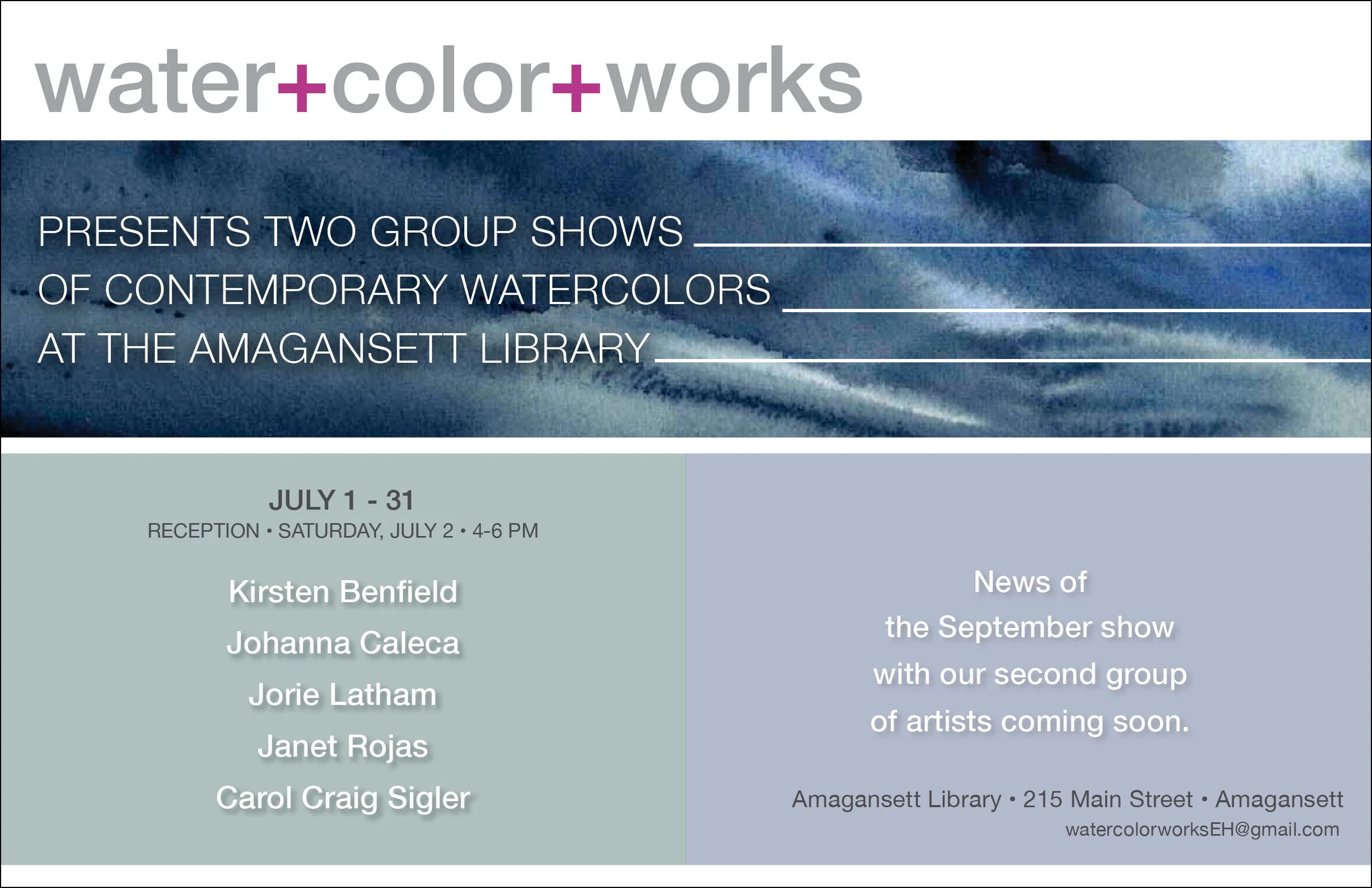 I am a founding member of water+color+works, a collective of East End Artists who paint together, and have shown annually together since 2016, and am in private collections throughout the US, New Zealand and Europe.